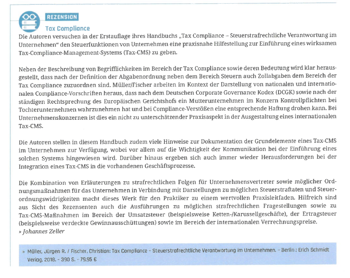 Die Rechtsanwälte der Müller Fischer Rechtsanwälte Partnerschaft mbB haben sich in den vergangenen Jahren dieser Herausforderung gestellt und Ihre Erfahrung in dem beim ESV Verlag erschienen Werk „Tax Compliance – Steuerstrafrechtliche Verantwortung im Unternehmen” dargestellt.